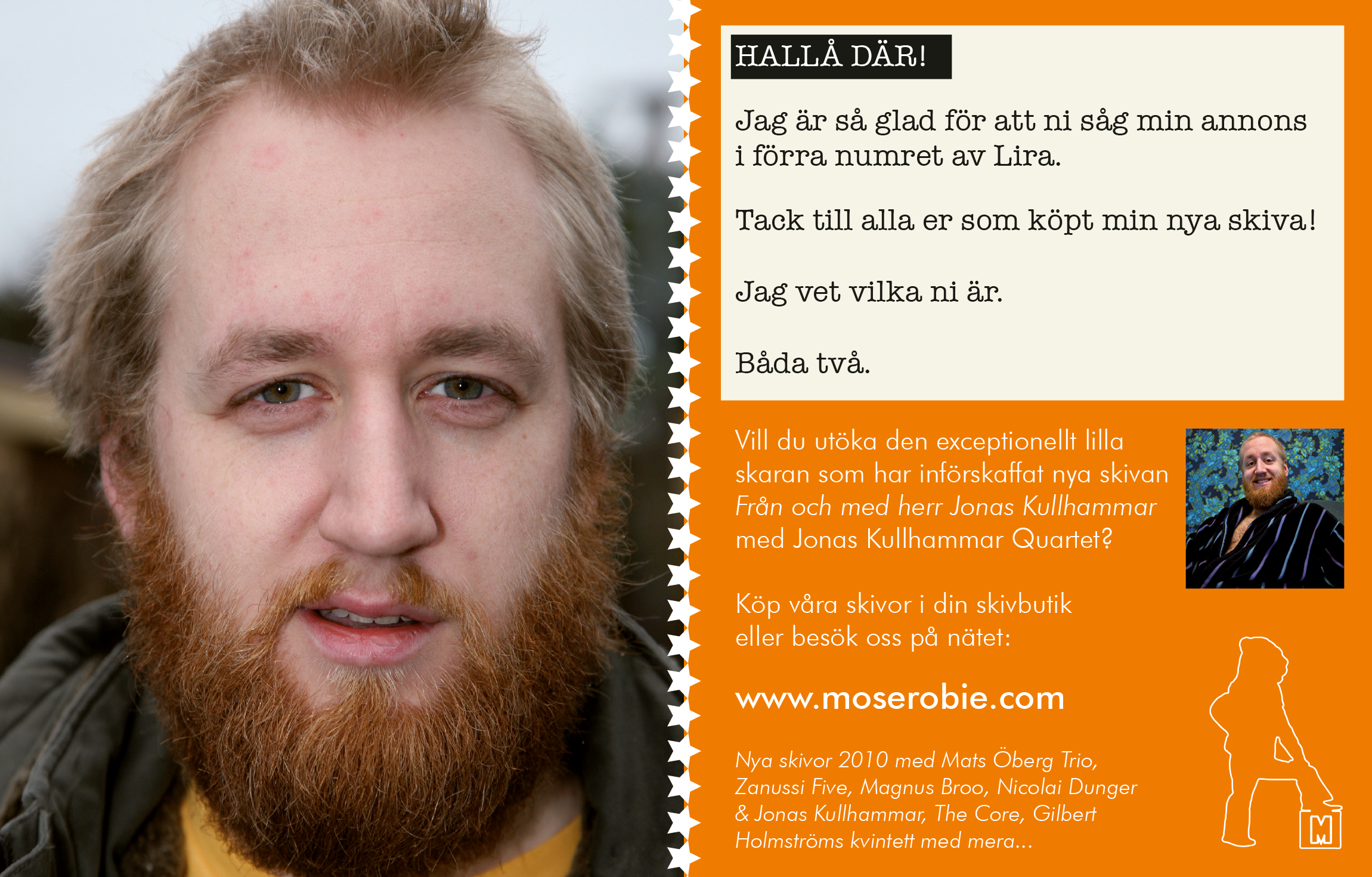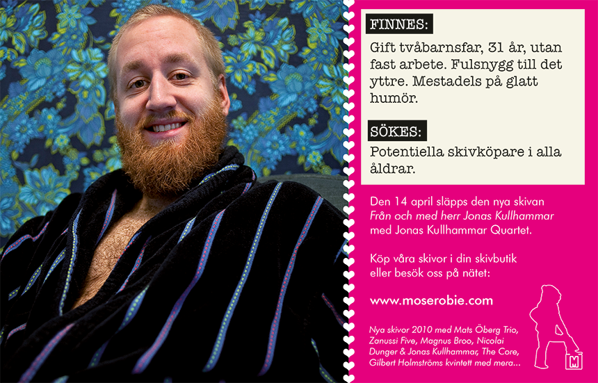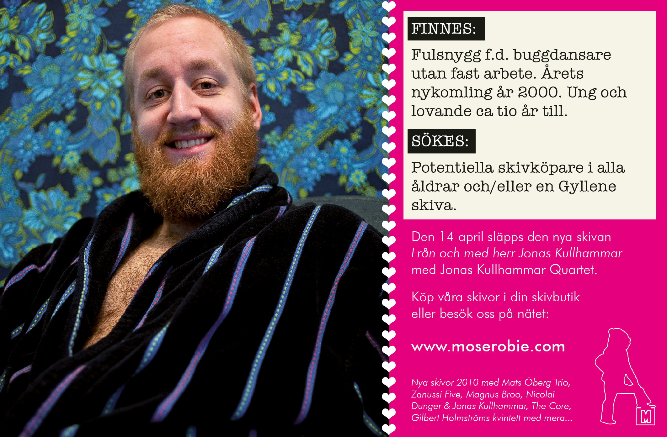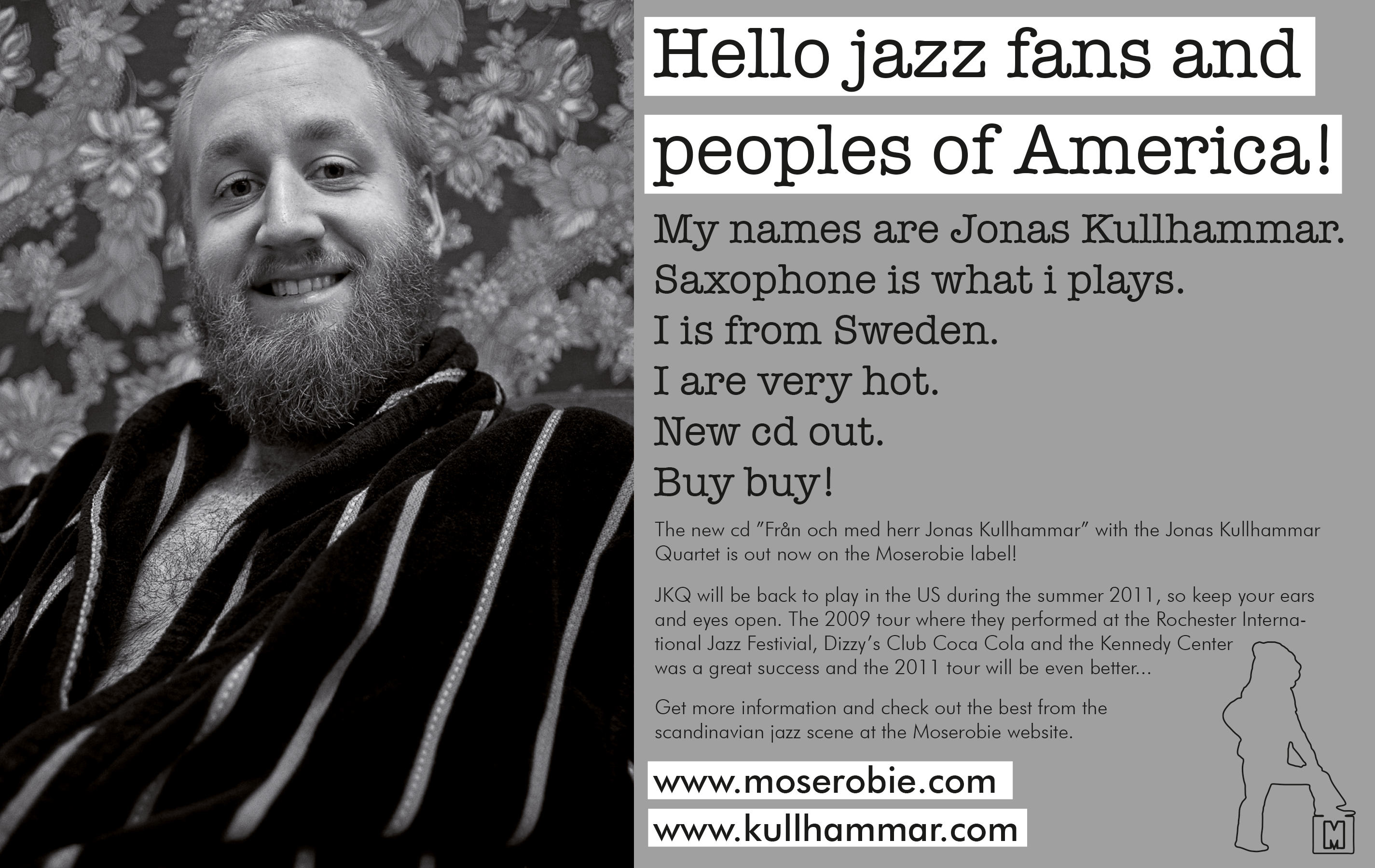 Våren 2010 utformade jag tillsammans med Jonas Kullhammar en annonskampanj för hans kvartetts då nysläppta skiva “Från och med herr Jonas Kullhammar”. Annonserna kördes i Orkesterjournalen, Lira och i den amerikanska tidningen All About Jazz.